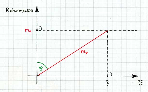 Die ‘dynamische Masse’ mv erhalten wir also, indem wir die ‘Ruhemasse’ mo durch unseren bekannten Wurzelausdruck dividieren, dem ja im Epsteindiagramm der Wert von cos(φ) entspricht. Daher können wir in einem einfachen Diagramm mo und mv darstellen:
