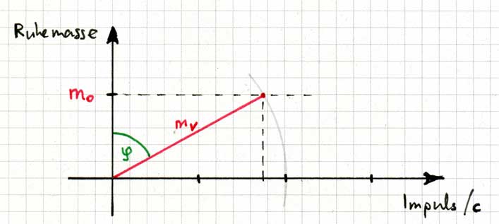 Je schneller ein Objekt ist, desto grösser wird der Winkel φ, und damit wachsen auch die dynamische Masse und der Impuls dieses Objektes an (wenn die Ruhemasse konstant bleibt). sin(φ) und cos(φ) behalten dabei ihre bisherige Bedeutung. Man sieht hier wieder, wie schön die Darstellung würde, wenn c einfach den einheitenlosen Wert 1 hätte: 1 Raumzeiteinheit pro Raumzeiteinheit. Der Weg von den gängigen technischen Einheiten zu den ‘natürlichen’ ist aber leicht zu beschreiten; er steht dem Leser offen. Wir gestatten uns immerhin, bei diesem Diagramm vom Masse-Impuls-Diagramm zu sprechen.