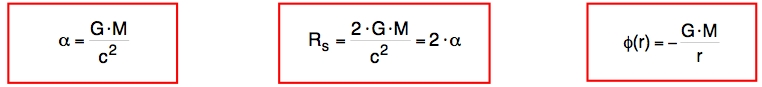 v2 = 2·G·M / r = - 2·Φ(r) und v2/c2 = 2·G·M / (c2·r ) = - 2·Φ(r) / c2 = 2·α / r = Rs / r