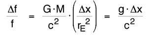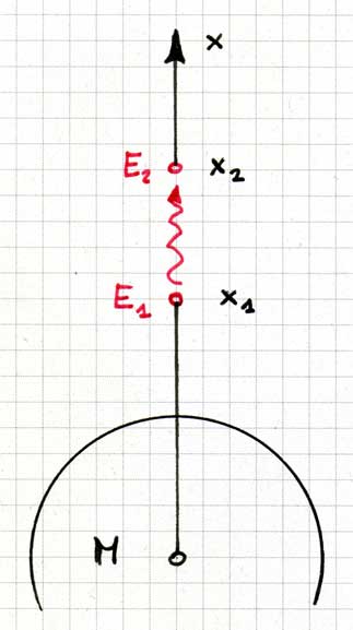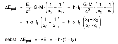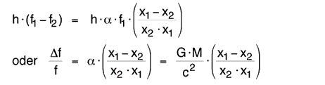 Fliegt ein Photon von x1 nach x2, so nimmt seine potentielle Energie zu und es muss deshalb ein bisschen von seiner inneren Energie E1 = h·f1 abgeben (mit h wird die Planck’sche Konstante bezeichnet). Am Ort x2 hat es die kleinere Energie E2 = h·f2 , die Frequenz der Strahlung ist also etwas kleiner und die Wellenlänge entsprechend der Formel c = f·λ etwas grösser geworden. Die Wellenlänge verschiebt sich damit in Richtung des roten, langwelligen Endes des optischen Spektrums, woher der Name ‘Rotverschiebung’ kommt. Für einen kleinen Aufstieg des Photons von x1 nach x2 gilt