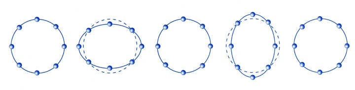 Alle erdgebundenen Detektoren weisen zwei zueinander senkrecht stehende Arme auf. Gravitationswellen sind nämlich Quadrupol-Wellen: Fällt eine solche Welle senkrecht auf diese Blattebene ein, so wirkt sie auf 8 kreisförmig angeordnete frei fallende Testmassen wie oben gezeigt. Zuerst wird der Raum in einer Richtung gestaucht und in der senkrecht dazu stehenden gestreckt, dann erfolgt dasselbe mit vertauschten Richtungen. Die Metrik der Raumzeit ‘wabbert’ also ein bisschen. Das bewirkt, dass die Laufzeiten der aufgeteilten Hälften des Laserstrahls in den beiden Armen des Interferometers für eine kurze Zeit bei feststehenden Spiegeln schwanken. Daher sollten sich die beiden Teilstrahlen nach der Wiedervereinigung nicht mehr per Interferenz permanent auslöschen (so die Voreinstellung); sondern es sollte ein kurzzeitiges Aufflackern sichtbar werden.