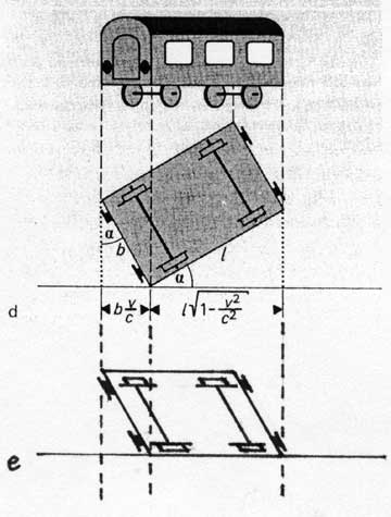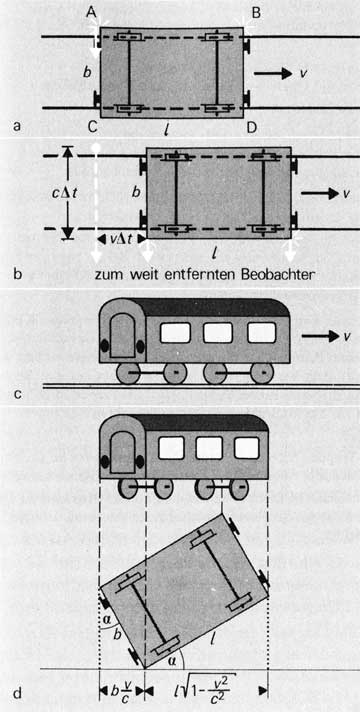 So sehen wir den Wagen tatsächlich, da ja der Abstand der Ecken C und D infolge der hohen Geschwindigkeit v geschrumpft ist.