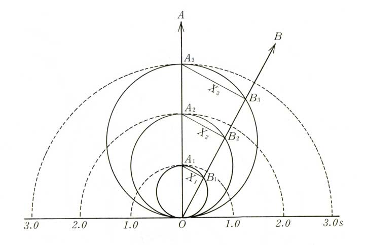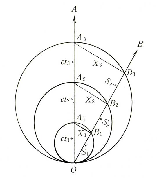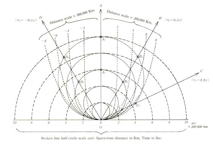 Aber auch die für die Epstein-Diagramme charakteristischen Halbkreise um O tauchen gelegentlich in den Diagrammen der Brüder Asano auf; bezeichnen dort aber nur die für A verflossenen Zeitintervalle. Die Diagramme zeigen eine Streckung mit Zentrum O und einem Streckungsfaktor, welcher der Zeit proportional ist [47-50]: