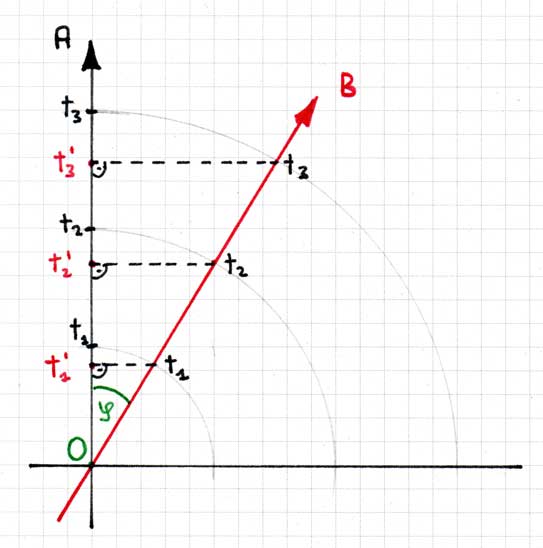 A und B sind sich in O begegnet und haben dabei beide ihre Uhren auf null gestellt. Der Sinus des Winkels AOB ist v/c, bei B1, B2 und B3 haben wir nach dem Satz des Thales rechte Winkel.